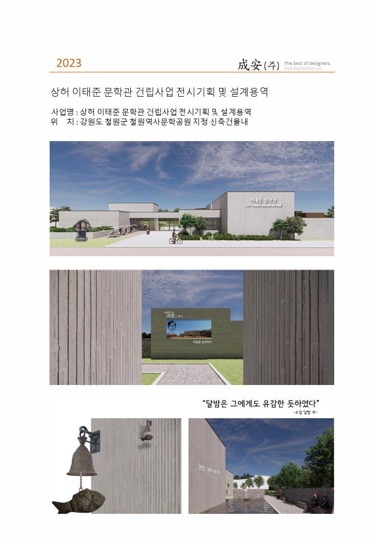 상허 이태준 문학관 건립사업 전시기획 및 설계용역 페이지 정보 작성자 관리자 댓글 0건 조회 599회 작성일 24-03-28 12:52 본문 상허 이태준 문학관 건립사업 전시기획 및 설계용역 목록 목록 이전글사북시장 시설현대화사업 간판 제조 설치 24.03.28 다음글산림생태문화체험단지 방문자센터 전시공사(전시시설 제작 및 설치용역) 24.03.28