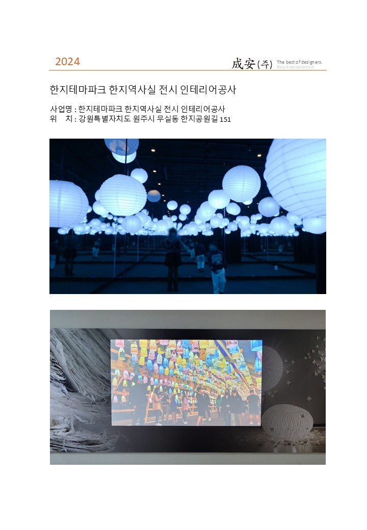 한지테마파크 한지역사실 전시 인테리어공사 페이지 정보 작성자 관리자 댓글 0건 조회 182회 작성일 25-06-25 15:33 본문 한지테마파크 한지역사실 전시 인테리어공사 목록 목록 이전글소노벨 청송 홍보관 리모델링 공사 25.06.25 다음글간현관광지 에스컬레이터 내부 플랜테리어 제작 설치 24.03.28