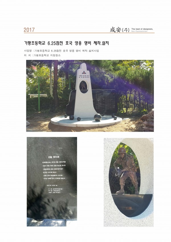 가평초등학교 6.25참전 호국 영웅 명비 제작, 설치 페이지 정보 작성자 관리자 댓글 0건 조회 605회 작성일 23-11-23 17:00 본문 가평초등학교 6.25참전 호국 영웅 명비 제작, 설치 목록 목록 이전글월남전 참전기념탑(조형물) 제작,설치 23.11.23 다음글창원지방검찰청 진주지청사 상징조형물 제작 23.11.23